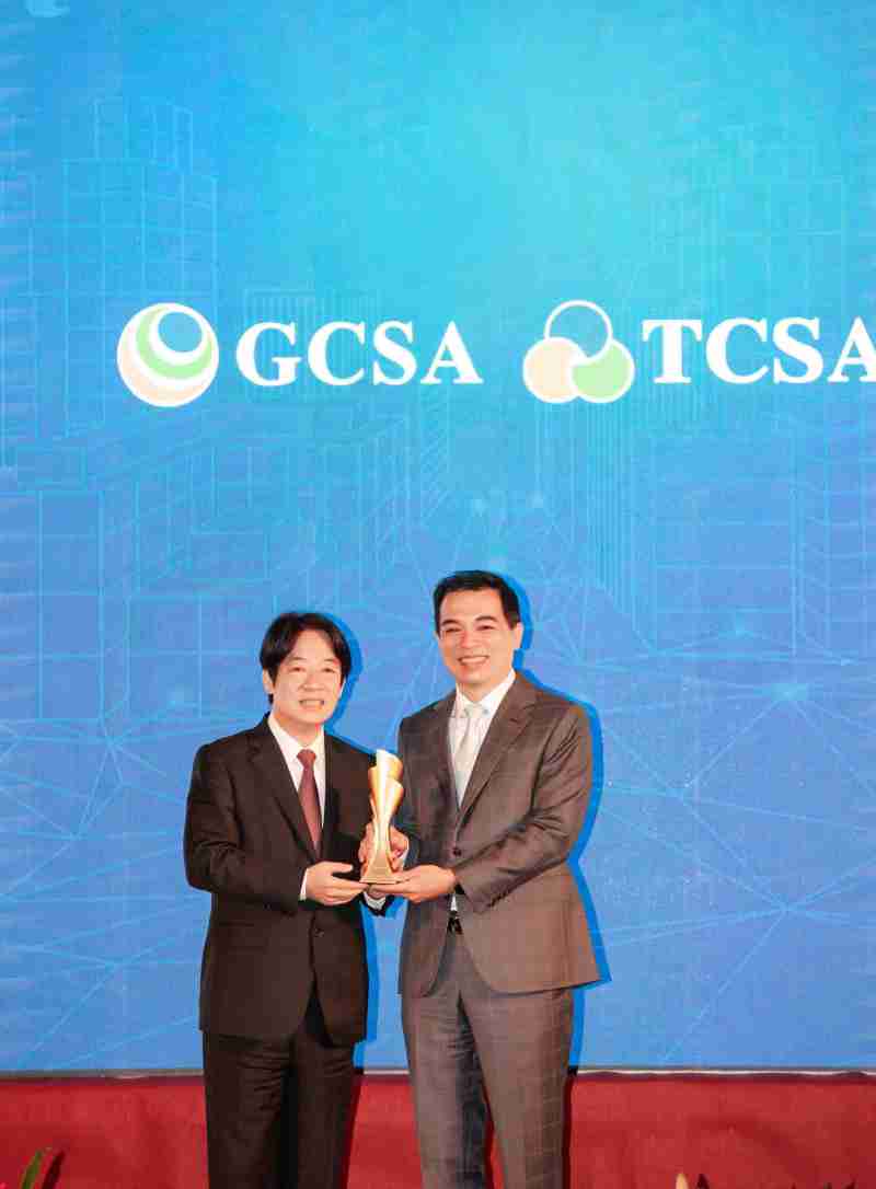 达全方位永续表现获全球永续奖及台湾永续奖肯定,,由副总统赖清德颁奖 (左),,,传奇国际总经理柯富仁 (右) 代表领奖