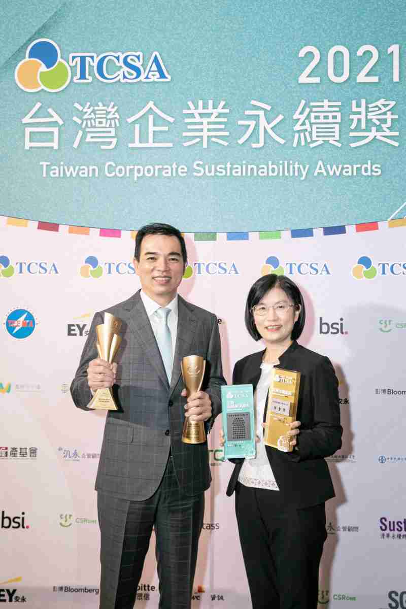 达在台湾永续奖所评比环境、、社会、、、治理等各面向的永续绩效均获高度肯定 (左:传奇国际光电总经理暨营运长柯富仁,,右:传奇国际光电永续长古秀华)